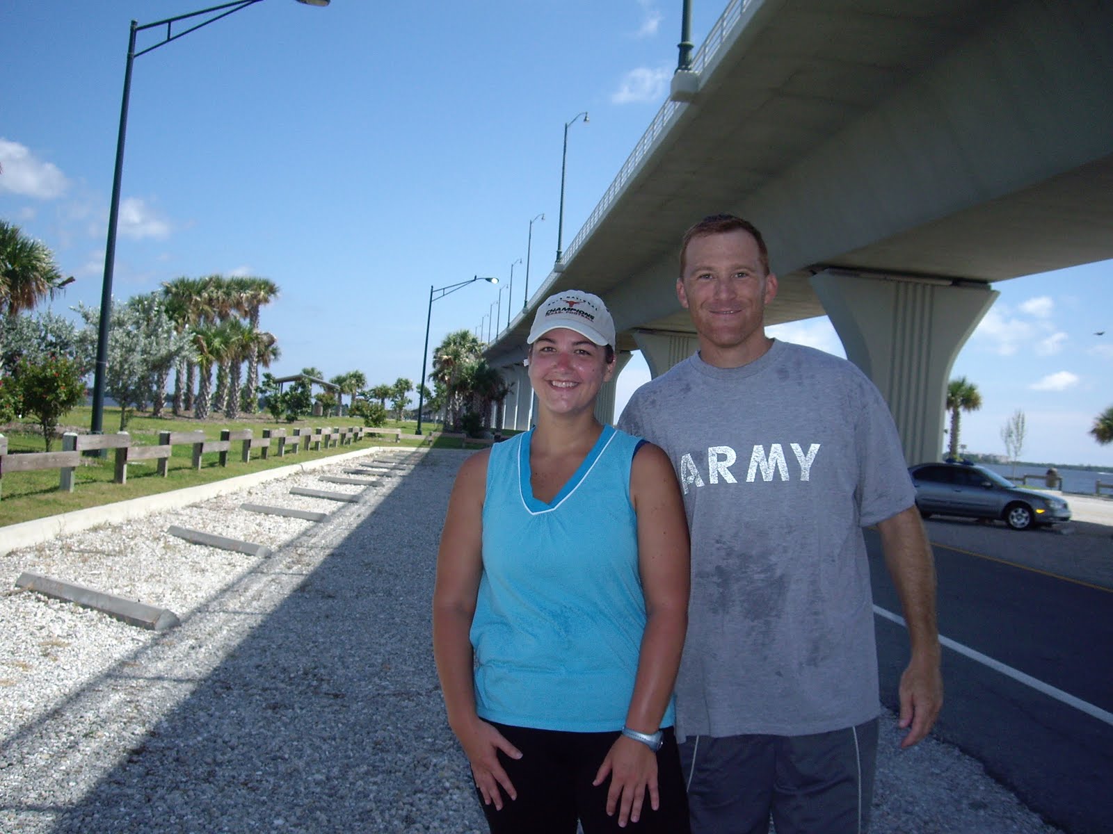 We did some running today along with our walking. My son enjoyed watching the boats and keeping an eye out for dolphins. Here is a pic of me and Charles feeling accomplished after conquering "The Bridge".