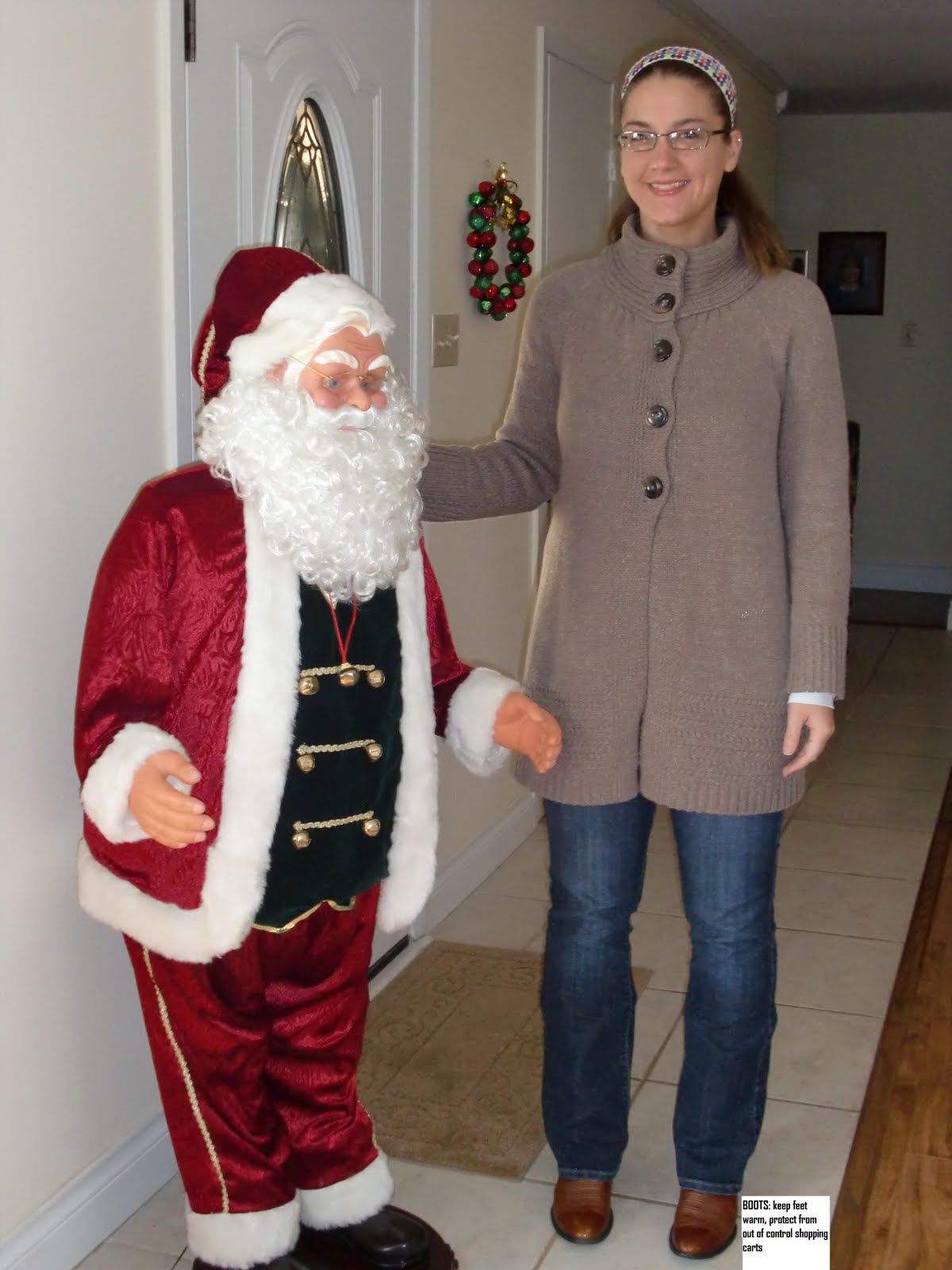 Getting dressed for battle: He didn't take me seriously, but after years of experience, I knew what I was facing. I wore jeans for comfort and warmth, picked dark ones to cover any spills that may happen through the night. (hello, jostled arms and hot coffee)I picked a thin, long sleeved running top and wore a thick (padding from elbows thrown) sweater over it. Next came compression socks to stave off swelling from a long night on my feet. Glasses instead of contacts, so I wouldn't have to worry about my eyes getting dried out during the long hours in the cold and wind.And then finally, my MUST HAVE Black Friday apparel item: Cowboy boots. The proper footwear is important. They need to be comfortable, and be able to take a beating. Shopping carts over the toes are no joke.