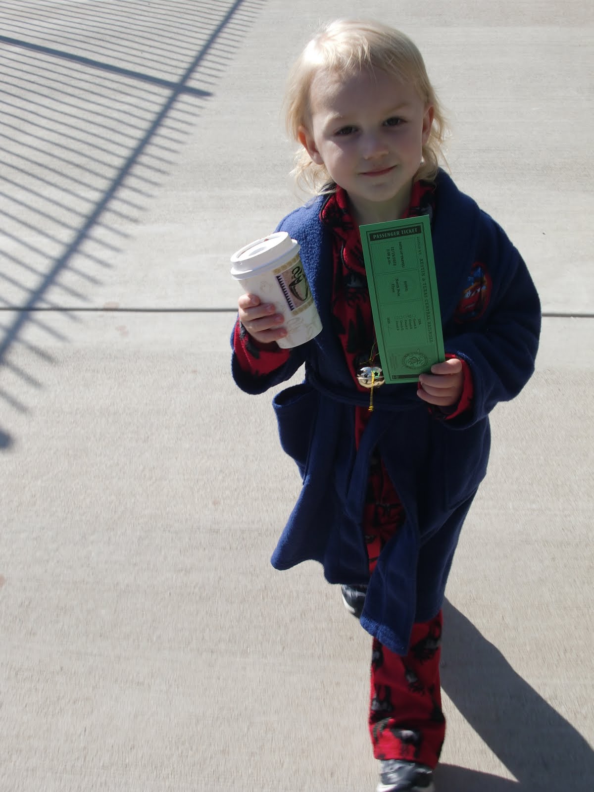 For those of you that haven't seen Polar Express, its basically about a little boy that starts to doubt there is a Santa. In the middle of the night a train pulls up in front of his house. On board is other children with similar doubts. The little boy is persuaded to join them on the train (as I'm typing this I'm starting to wonder about what lesson I'm teaching my kiddo... ). Anyway, they all ride to the North Pole and get to see Santa and the elves. The experience fills them with the Christmas spirit and their belief in Santa is restored.