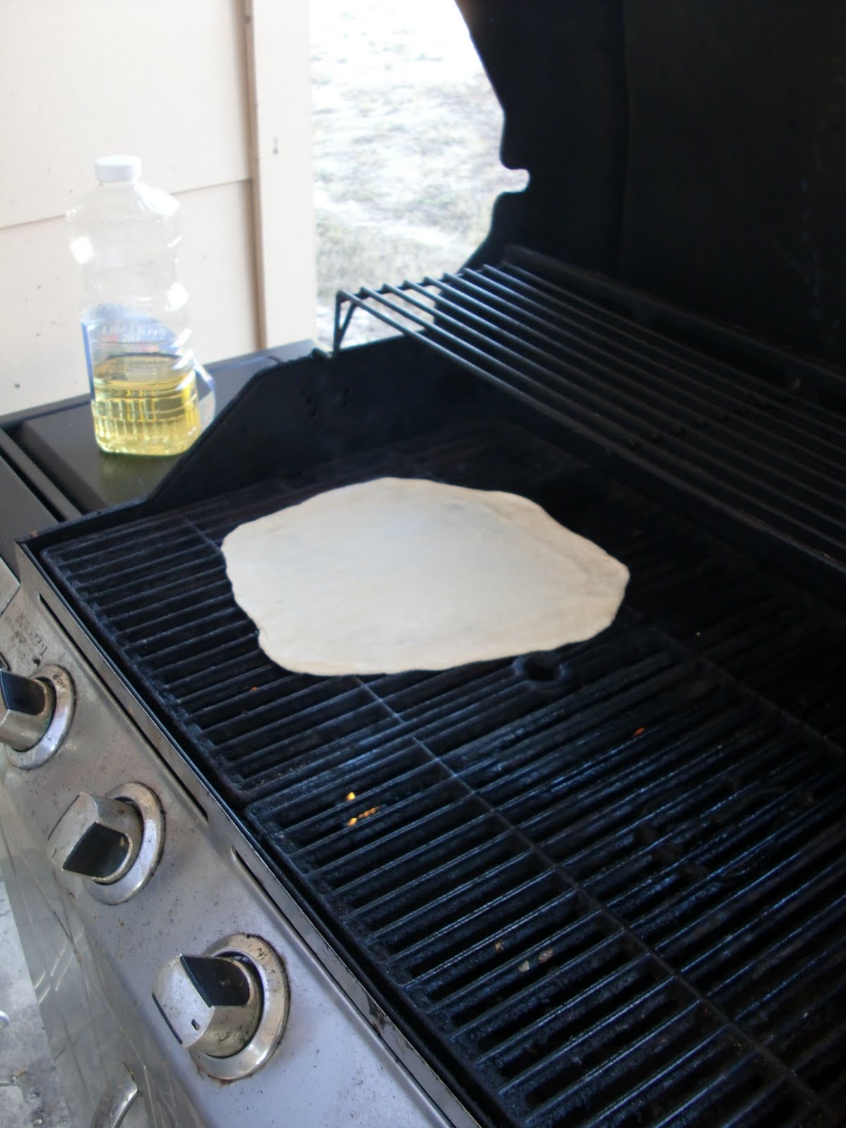 We brush a little olive oil on one side, and then place it on the hot (oiled) grill.