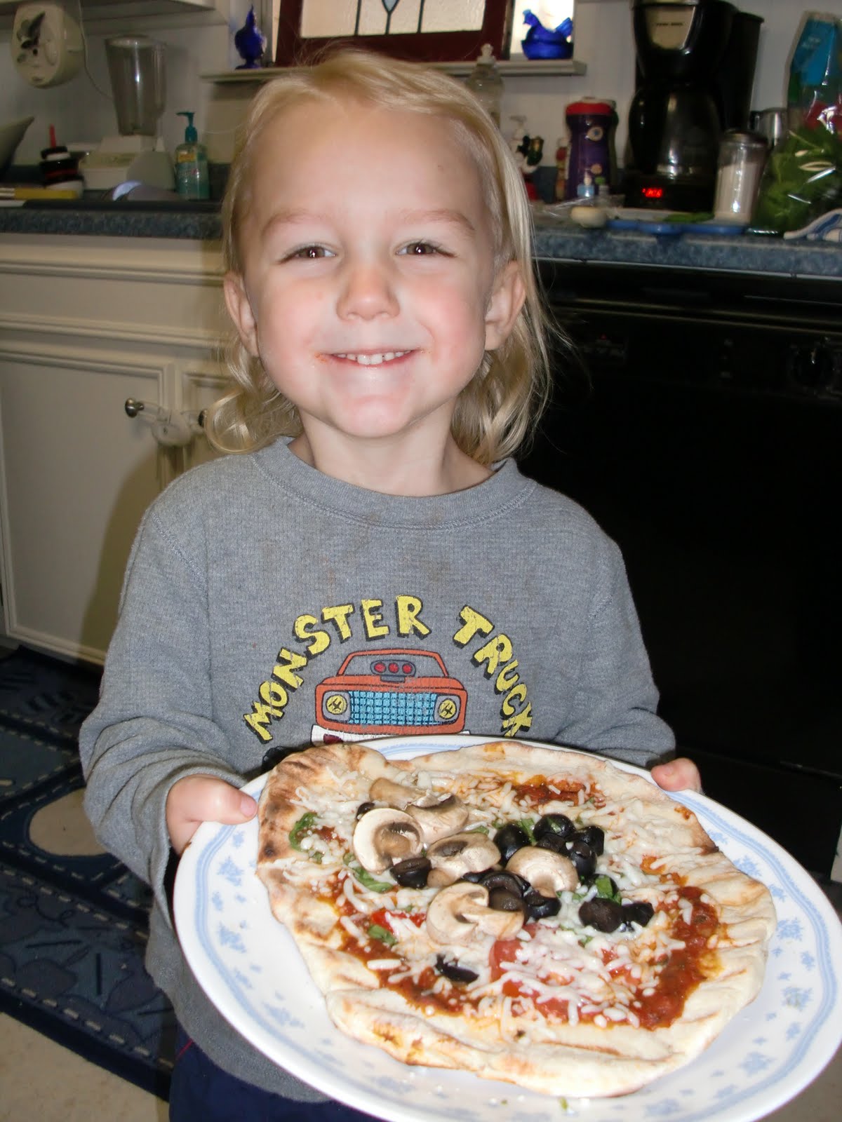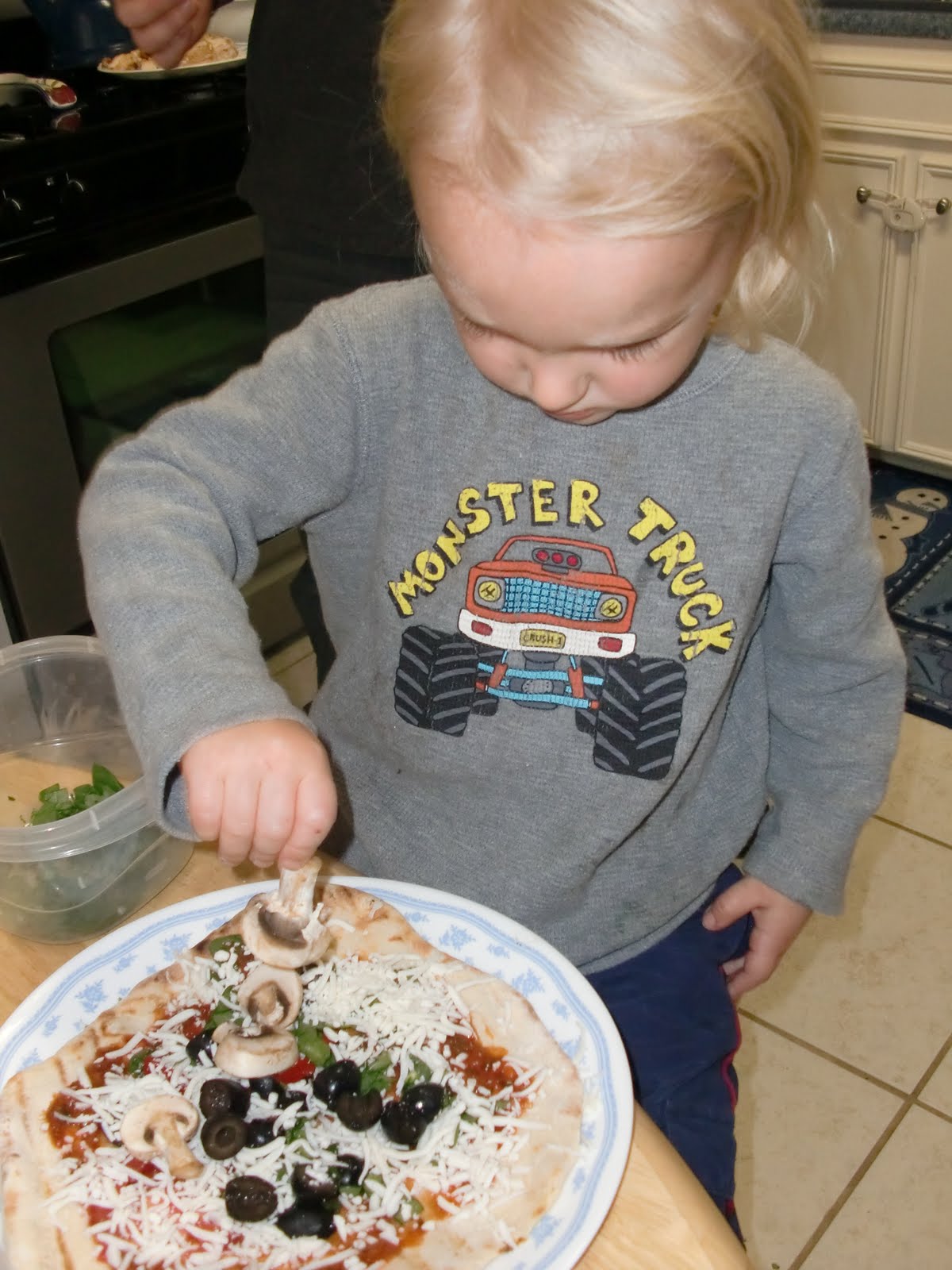 Its a great chance to get your kiddos involved. Let them select their own toppings, Dash picked out lots of mushrooms.