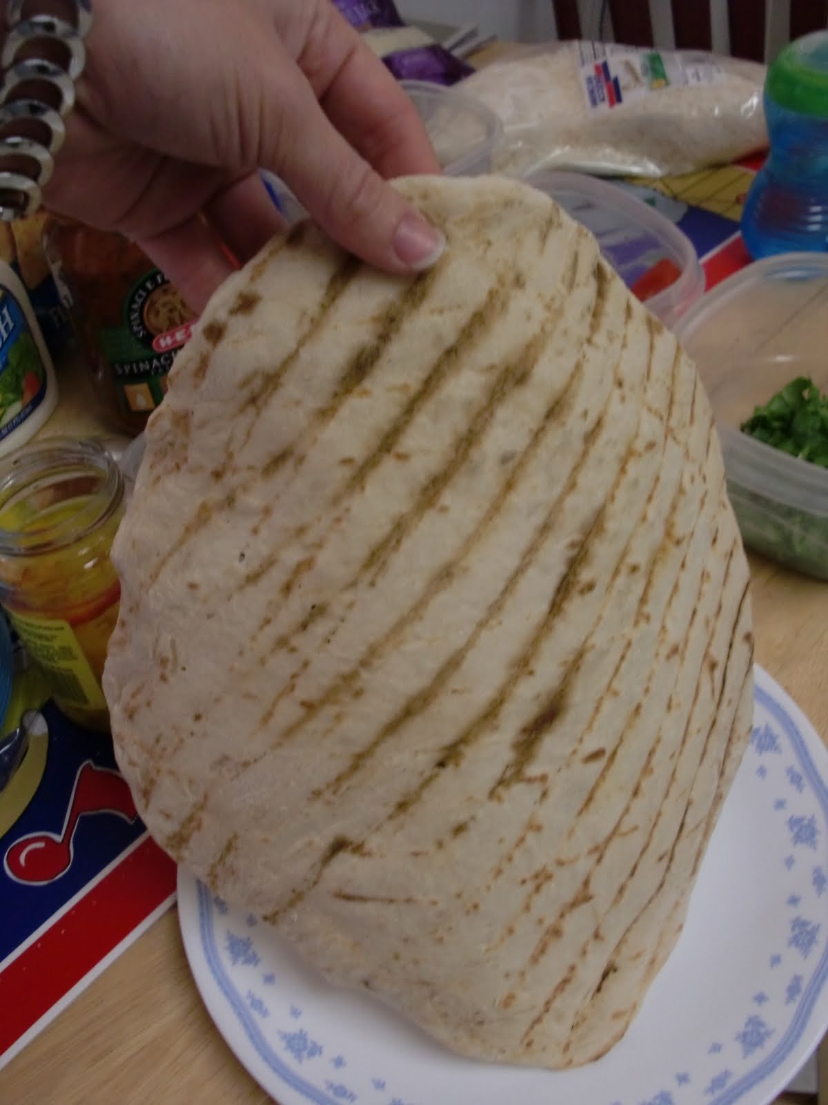 When one side is grilled, we bring it in and start selecting toppings to dress the GRILLED side.